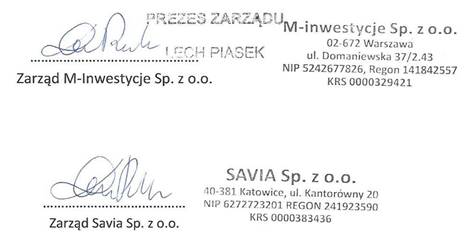 Zarządy Spółek: M-Inwestycje Sp. z o.o. z siedzibą w Warszawie jako Spółki Przejmującej oraz SAVIA Sp. z o.o. z siedzibą w Katowicach - Spółka Przejmowana, zawiadamiają, że zamierzają połączyć Spółkę:M-lnwestycje Sp. z o.o. z siedzibą w Warszawie (02-672) przy ul. Domaniewskiej 37/2.43, wpisana do rejestru przedsiębiorców prowadzonego przez Sąd Rejonowy dla M.St. Warszawy w Warszawie Wydział XIII Gospodarczy KRS pod numerem KRS0000329421, jako Spółkę Przejmującą, ze Spółką Przejmowaną: Savia Sp. z o.o. z siedzibą w Katowicach (40-381) przy ul. Kantorówny 20, wpisana do rejestru przedsiębiorców prowadzonego przez Sąd Rejonowy Katowice-Wschód w Katowicach, VIII Wydział Gospodarczy KRS pod numerem KRS 0000383436